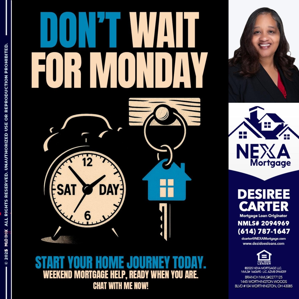 Hi, my name is Desiree Carter. I’m a Loan Officer with NEXA Mortgage LLC., offering personalized mortgage solutions, fast customized quotes, great rates and service with integrity.