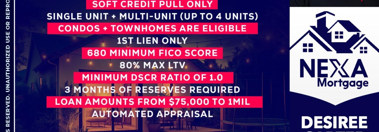 DSCR LOAN - Desiree Carter -Mortgage Loan OriginatorHi, my name is Desiree Carter. I’m a Loan Officer with NEXA Mortgage LLC., offering personalized mortgage solutions, fast customized quotes, great rates and service with integrity.