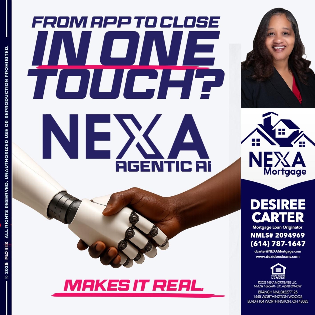 Hi, my name is Desiree Carter. I’m a Loan Officer with NEXA Mortgage LLC., offering personalized mortgage solutions, fast customized quotes, great rates and service with integrity.
