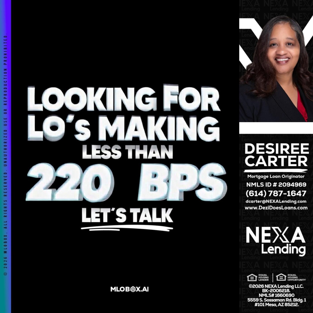 Hi, my name is Desiree Carter. I’m a Loan Officer with NEXA Lending LLC., offering personalized mortgage solutions, fast customized quotes, great rates and service with integrity.