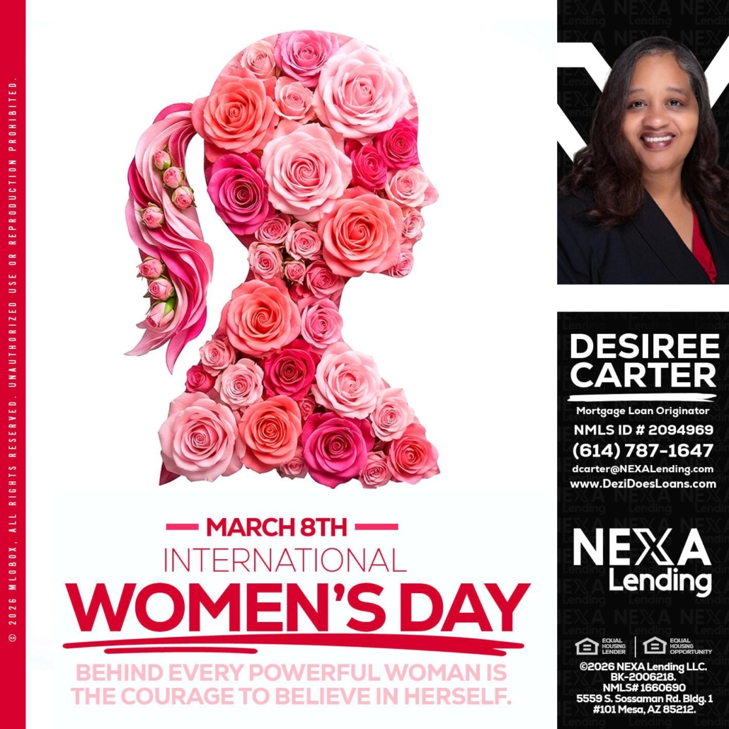 MARCH 8TH - Desiree Carter -Mortgage Loan OriginatorHi, my name is Desiree Carter. I’m a Loan Officer with NEXA Lending LLC., offering personalized mortgage solutions, fast customized quotes, great rates and service with integrity.