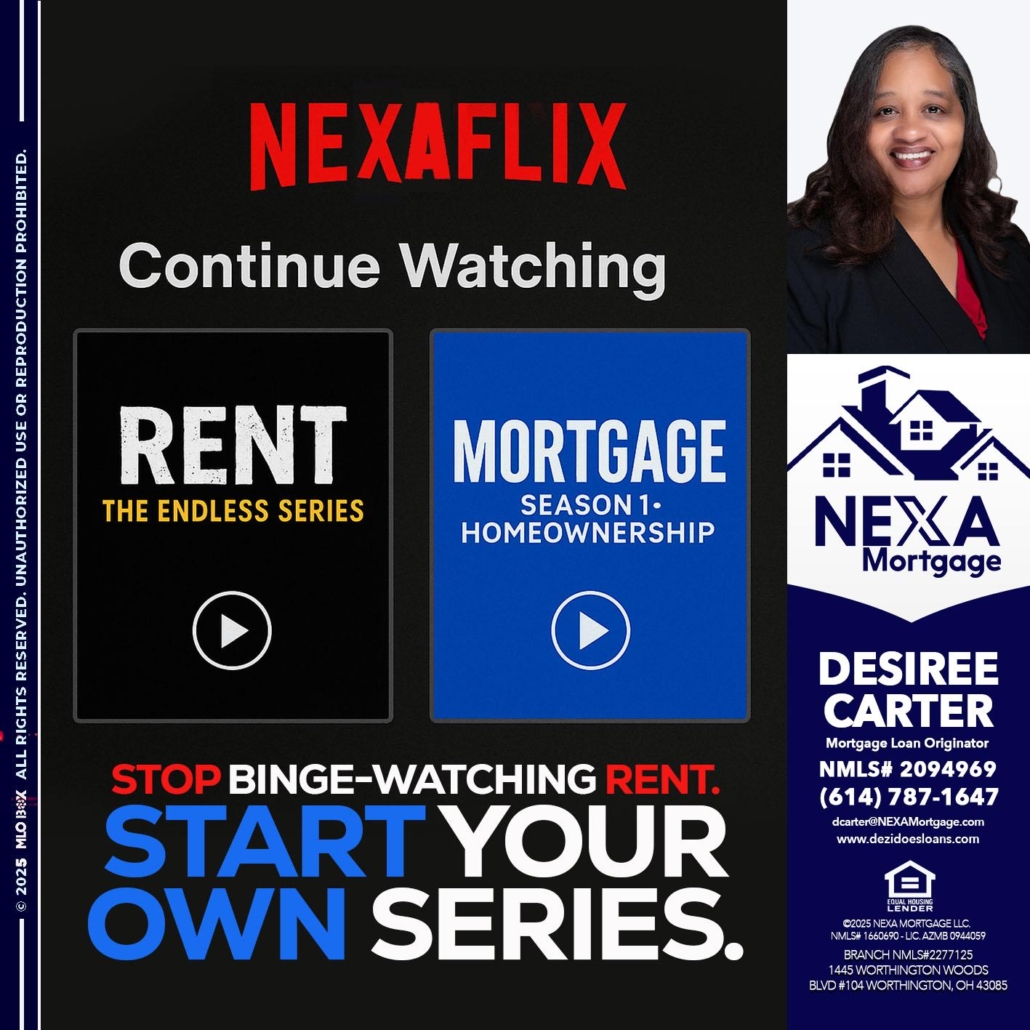 NEXAFLIX - Desiree Carter -Mortgage Loan OriginatorHi, my name is Desiree Carter. I’m a Loan Officer with NEXA Mortgage LLC., offering personalized mortgage solutions, fast customized quotes, great rates and service with integrity.