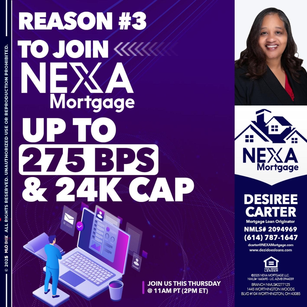 Hi, my name is Desiree Carter. I’m a Loan Officer with NEXA Mortgage LLC., offering personalized mortgage solutions, fast customized quotes, great rates and service with integrity.