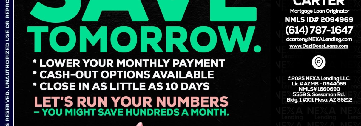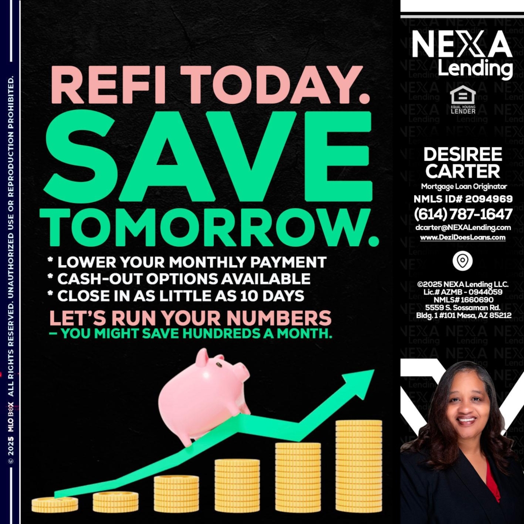REFI TODAY SAVE TOMORROW - Desiree Carter -Mortgage Loan OriginatorHi, my name is Desiree Carter. I’m a Loan Officer with NEXA Mortgage LLC., offering personalized mortgage solutions, fast customized quotes, great rates and service with integrity.