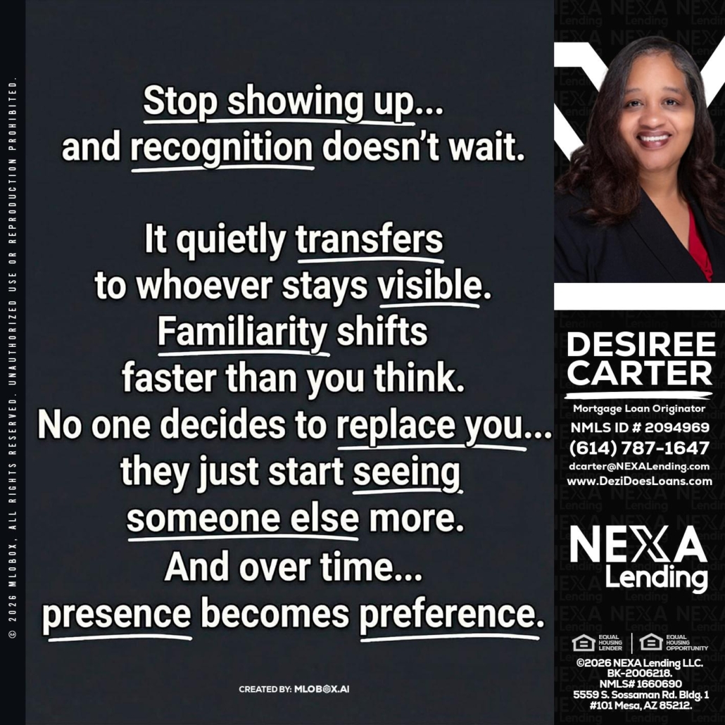 Hi, my name is Desiree Carter. I’m a Loan Officer with NEXA Lending LLC., offering personalized mortgage solutions, fast customized quotes, great rates and service with integrity.