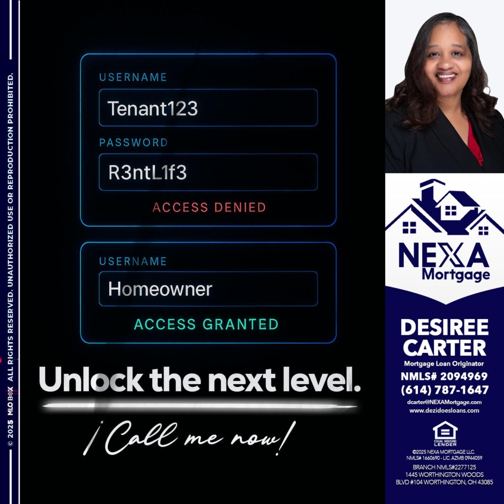 UNLOCK THE NEXT LEVEL - Desiree Carter -Mortgage Loan OriginatorHi, my name is Desiree Carter. I’m a Loan Officer with NEXA Mortgage LLC., offering personalized mortgage solutions, fast customized quotes, great rates and service with integrity.