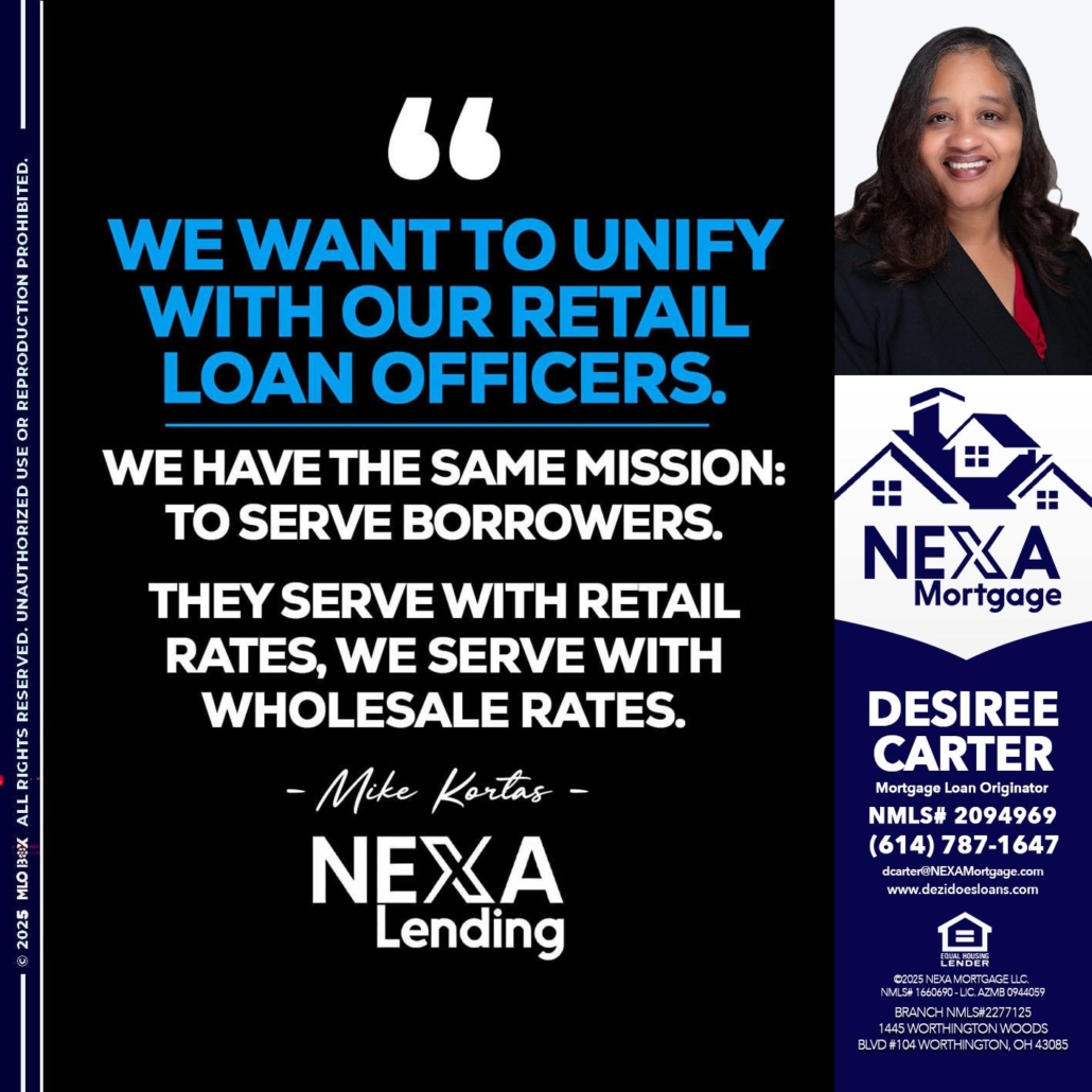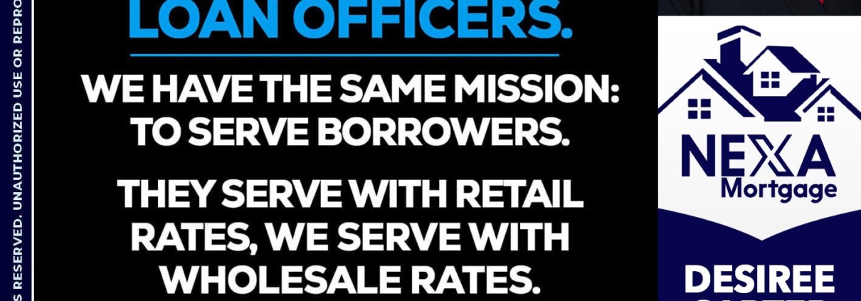 WE WANT - Desiree Carter -Mortgage Loan OriginatorHi, my name is Desiree Carter. I’m a Loan Officer with NEXA Mortgage LLC., offering personalized mortgage solutions, fast customized quotes, great rates and service with integrity.