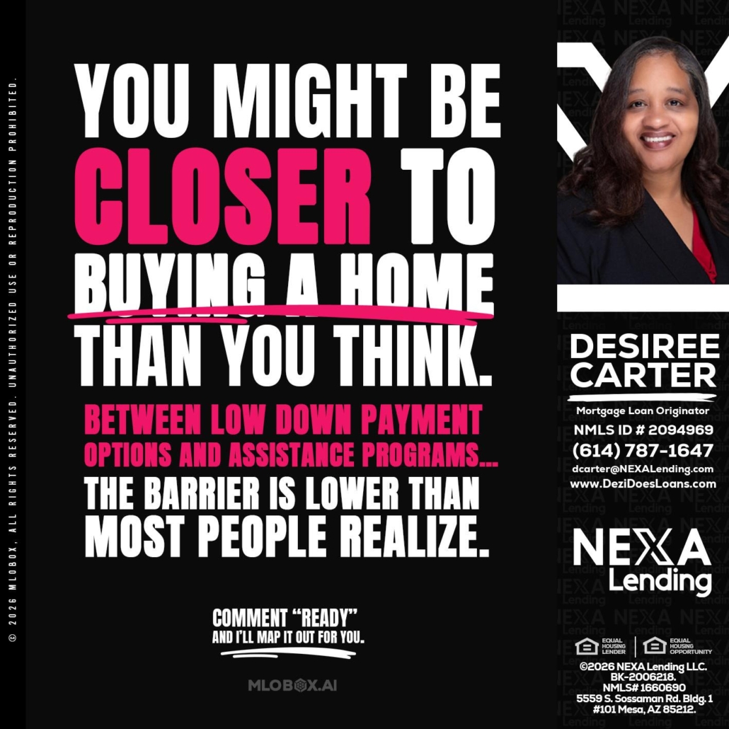 Hi, my name is Desiree Carter. I’m a Loan Officer with NEXA Lending LLC., offering personalized mortgage solutions, fast customized quotes, great rates and service with integrity.